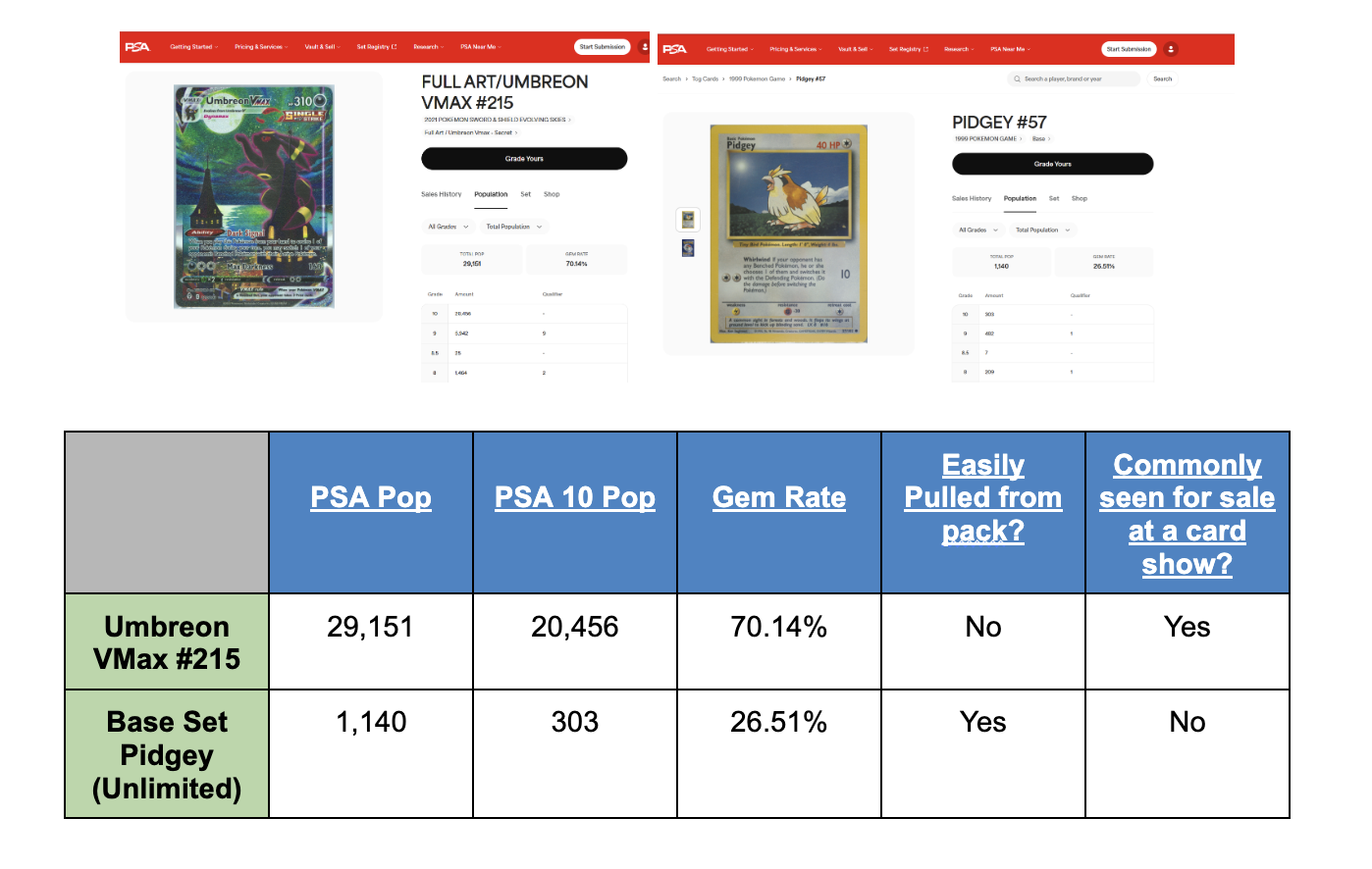 A useful comparison is Umbreon VMAX #215 (“Moonbreon”) v.s Base Set Unlimited Pidgey. Moonbreon was much harder to pull from packs, even though there are far more graded copies in circulation today. By contrast, Base Set Unlimited Pidgey was easier to pull originally, but is now seen far less often in the market due to age and lower preservation rates.