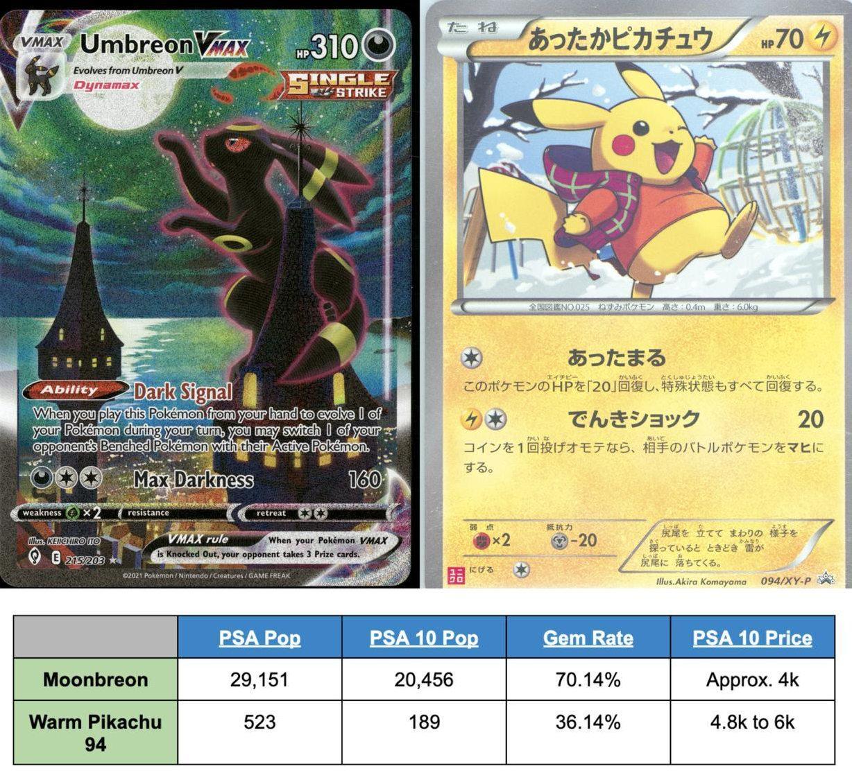 This becomes even more interesting when compared with Warm Pikachu 94, one of the 2014 Uniqlo Pikachu promos. That card is significantly rarer and scarcer based on PSA population, and it is also harder to gem at a PSA 10. Yet despite those stronger “fundamentals,” its pricing does not sit dramatically above Moonbreon.