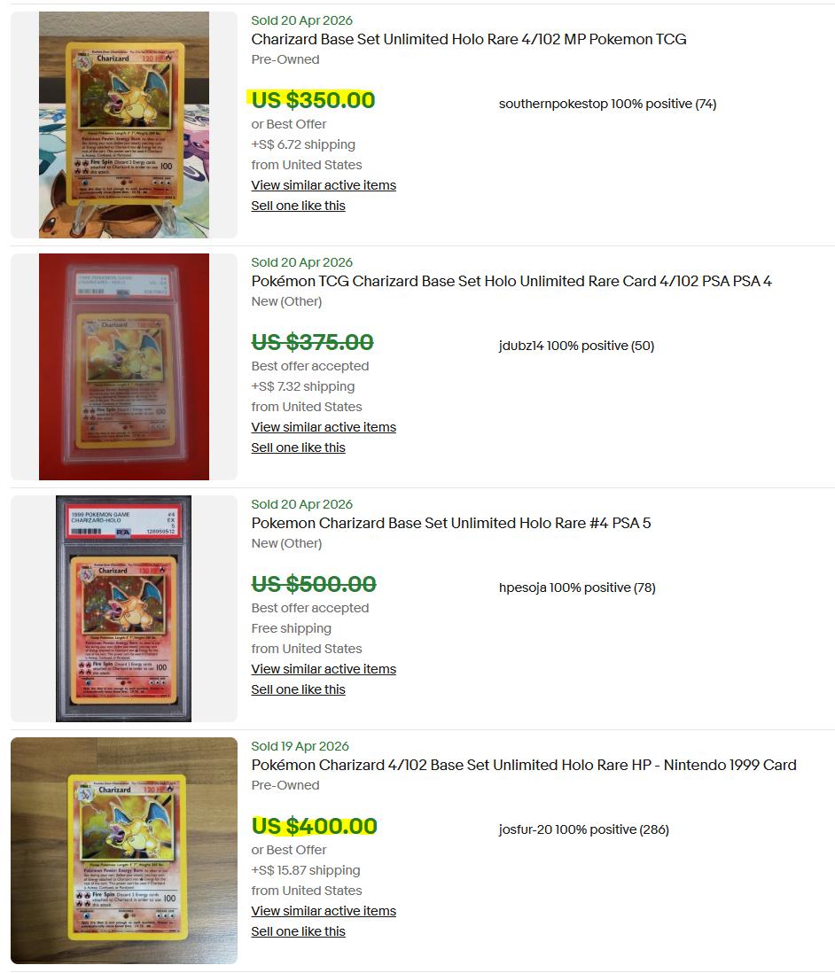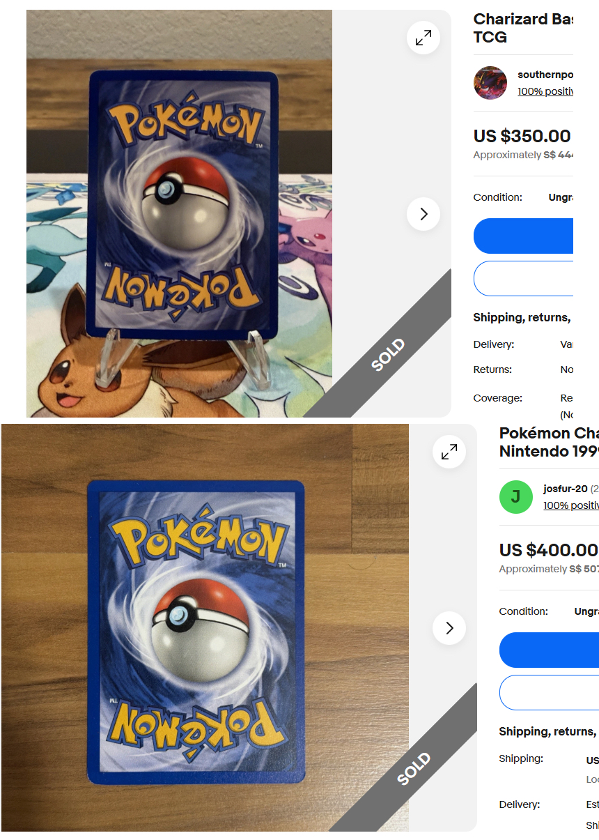 Regardless, it is important to know that for an exact same copy of a raw card, its value that can be sold for can differ greatly, solely based on its condition. We will use this Base Set Unlimited Charizard sales data to illustrate this point. Two ungraded copies sold at different prices, and the difference came down to condition. One card had visibly less whitening and stronger overall eye appeal, which supported a higher sale price.